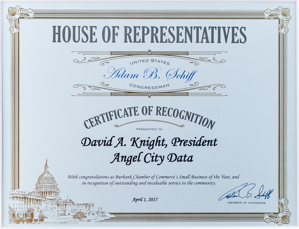 “This is a tremendous honor”, said David Knight, President of Angel City Data. “Our team is humbled and thrilled by this selection. We hope we’re able to give as much as we receive from our community and the Burbank Chamber of Commerce. Angel City Data was presented with an award statue and signed certificates from various State and local officials, including Los Angeles Mayor Eric Garcetti and Burbank Congressman Adam Schiff.