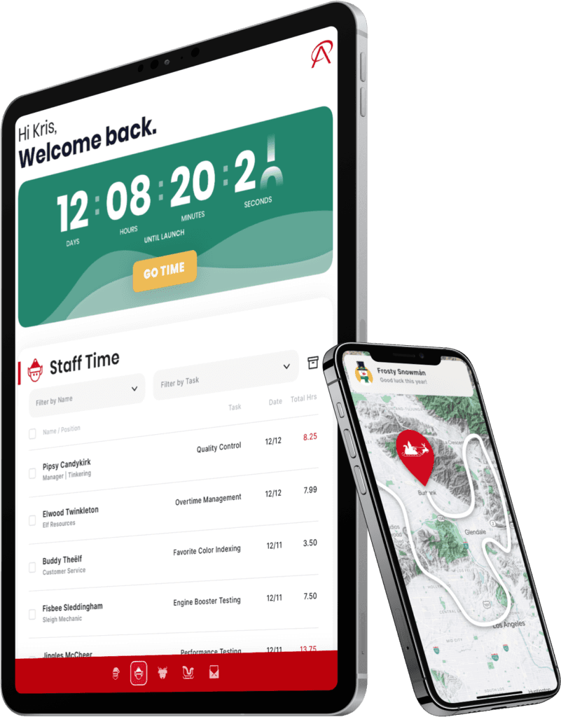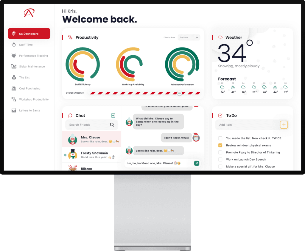 Saint Nick’s advanced age (about 900+ years old) also put him at a higher risk. His people just weren’t comfortable with Santa roaming the grounds, even with Mrs. Claus’ homemade mask to accommodate his great white beard. This led to the need for one centralized dashboard where he could quickly access and monitor each aspect of his operation, like elf productivity, toy production, and group texting of North Pole weather changes.